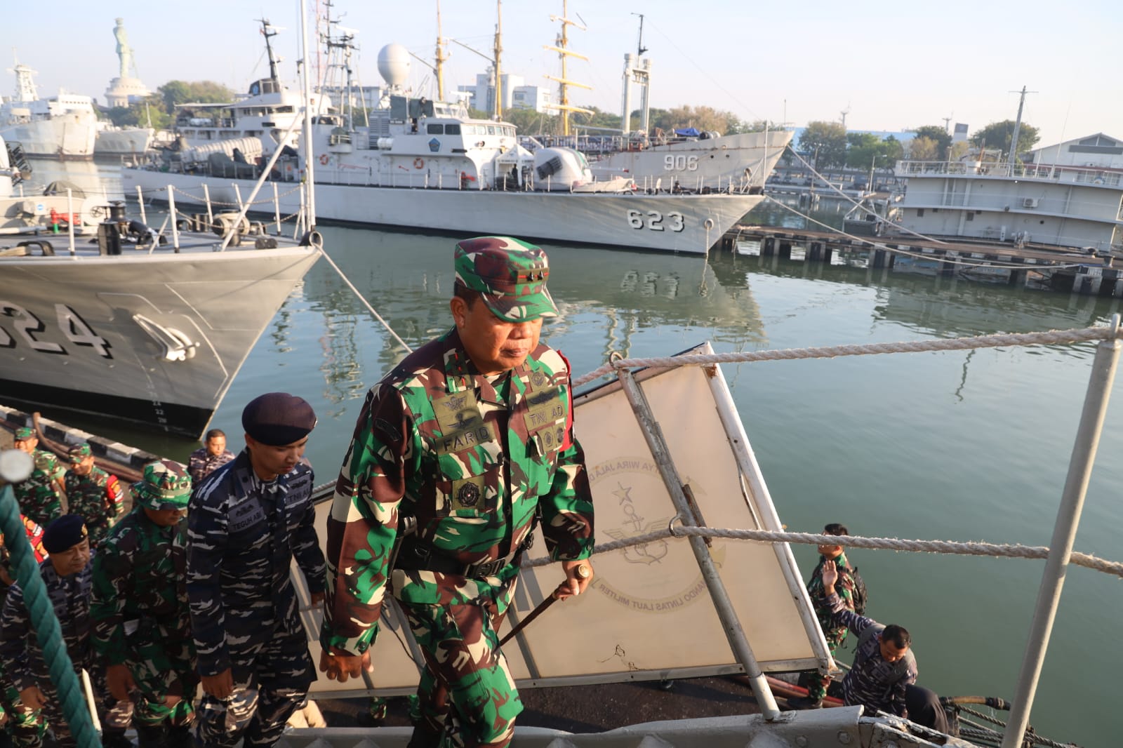 SURABAYA– Ratusan prajurit dibawah kendali Mayjen TNI Farid Makruf, M. A diberangkatkan menuju lokasi Latgab TNI 2023 di Situbondo, Jawa Timur. Pemberangkatan yang dilakukan pada Minggu (30/07/2023) itu, menggunakan empat KRI sekligus, diantaranya KRI Teluk Parigi, Banda Aceh, Calang dan KRI Teluk Lampung.