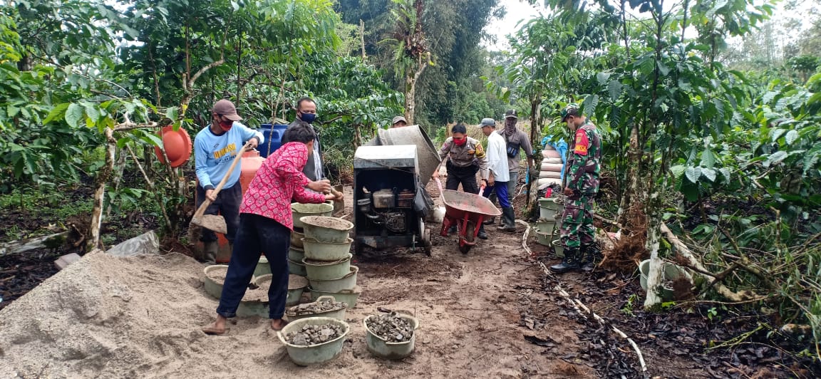 Babinsa Koramil 422-04/Balik Bukit Bantu Warga Pengecoran Jalan Desa