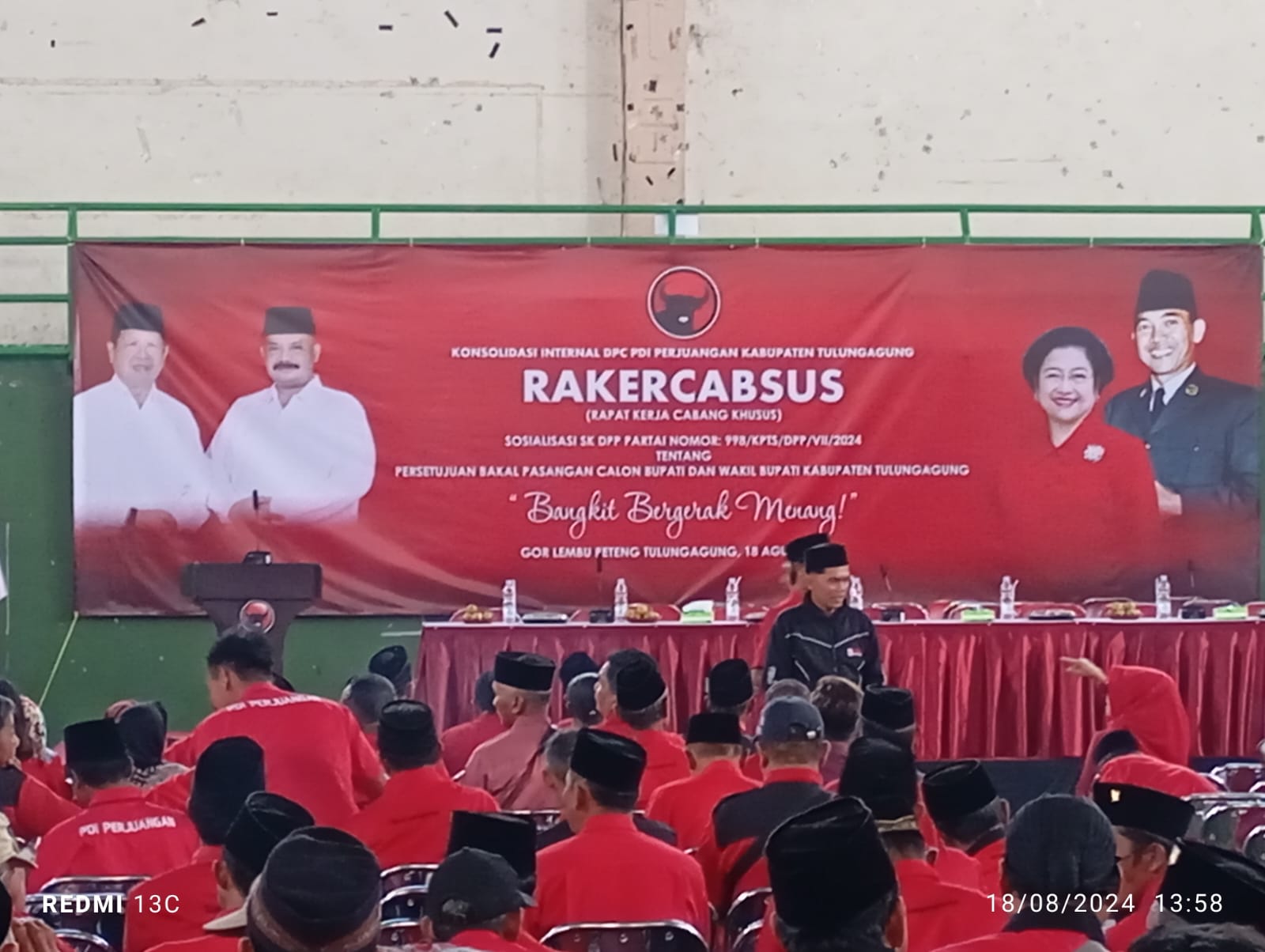 TULUNGAGUNG | GOR Lembu Peteng memerah setelah ratusan kader PDI-P Tulungagung memadati gedung yang berada di Jln Sukarno – Hatta tersebut. Sedikitnya 600 Kader Moncong putih didatangkan pengurus DPC PDI Perjuangan Tulungagung untuk menyolidkan seluruh struktural partai agar tetap taat dan tegak lurus terhadap keputusan DPP.