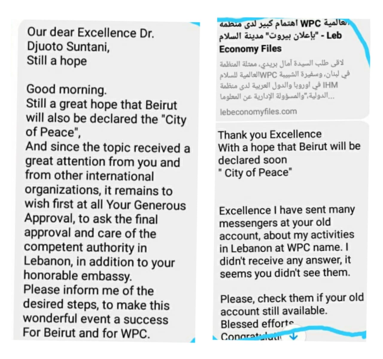 “Seluruh Bangsa Lebanon menunggu Kehadiran Presiden the World Peace Committee HE Mr Djuyoto Suntani di Beirut,” tulis Mr Bilal Almerhi di inbox facebook.