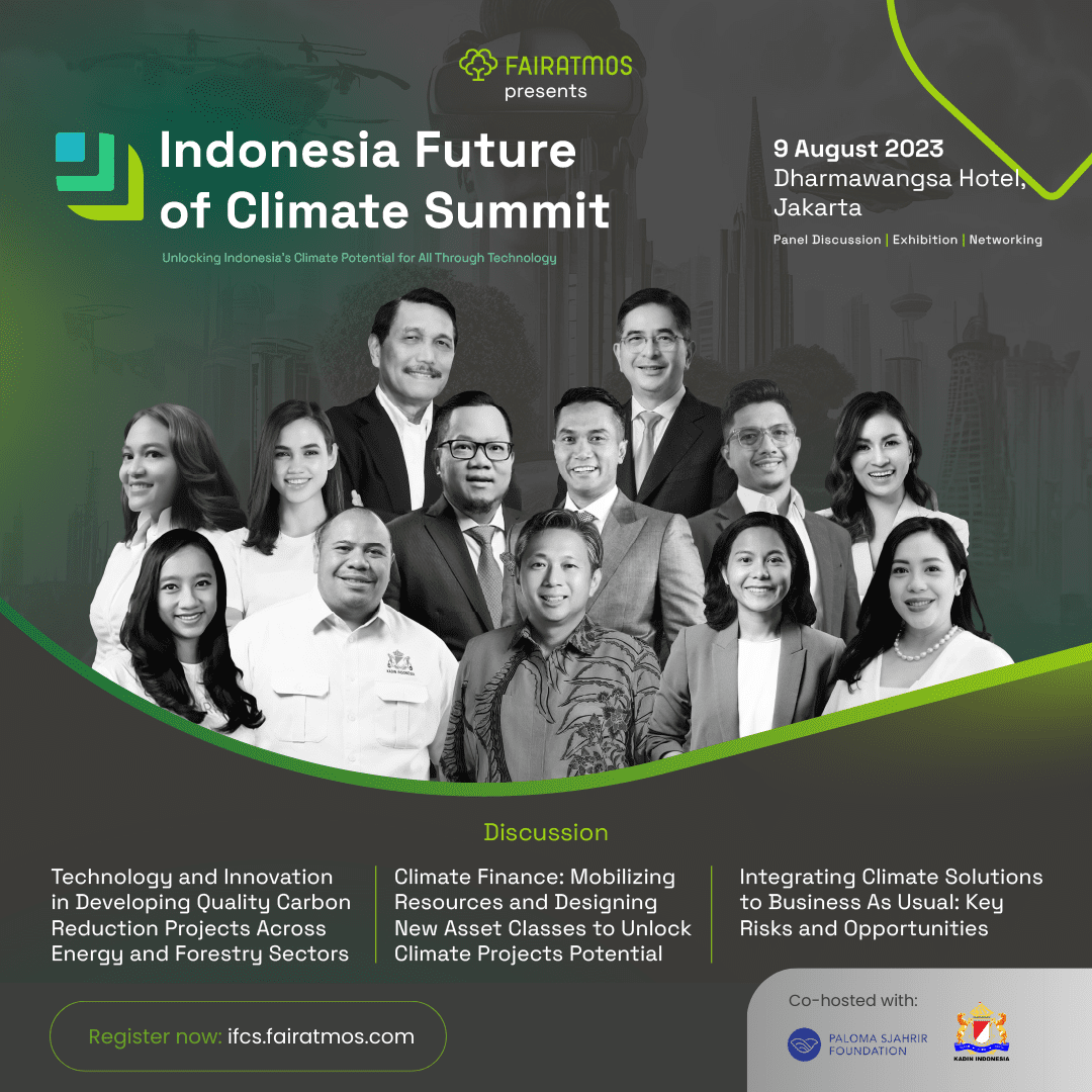 Fairatmos, Paloma Sjahrir dan Kamar Dagang dan Industri Indonesia (Kadin) menggelar acara dengan fokus topik teknologi iklim, “Indonesia Future of Climate Summit (IFCS) 2023” yang akan berlangsung pada tanggal 9 Agustus 2023 di the Dharmawangsa Hotel, Jakarta Selatan. Acara ini mengangkat ragam topik seputar peran teknologi dan sektor penting lainnya seperti sektor finansial dalam usaha bersama berbagai stakeholder memangkas emisi Gas Rumah Kaca (GRK). Informasi lebih lanjut dan pendaftaran dapat dilakukan melalui situs web resmi ifcs.fairatmos.com