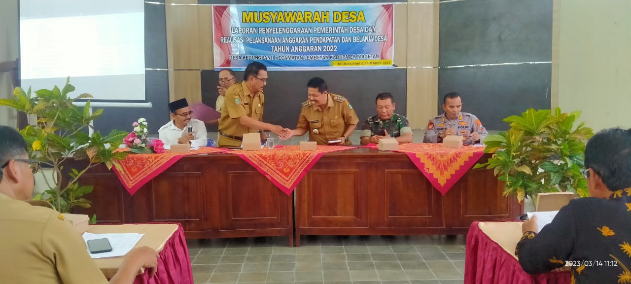 Turut hadir dalam acara giat yang rutin dilaksanakan diantaranya dari segenap jajaran Forkopimca Lembeyan, BPD, LPM, seluruh perwakilan RT/RW, dan tokoh masyarakat,serta juga dalam penanda tanganan pengesahan dilakukan Ketua BPD. Selain itu dalam materi pemaparan Laporan Pertanggungjawaban tersebut disampaikan langsung oleh Sekretaris Desa Kedungpanji, Endang Lestari.