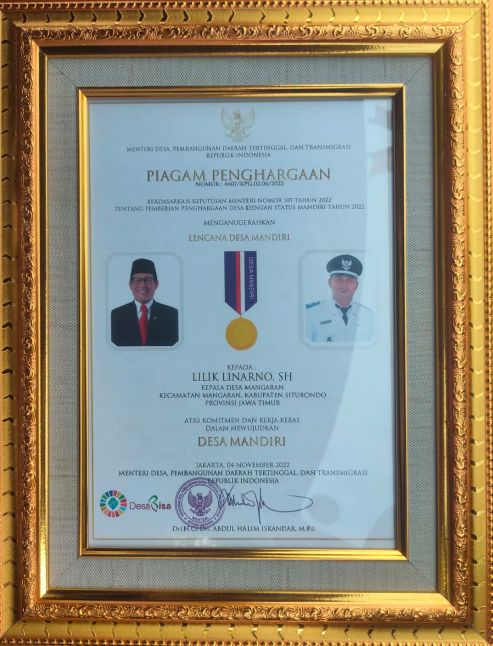 Inar Raja, selaku Kades Mangaran mengatakan, “Hari ini di Kabupaten Situbondo ada 16 desa yang menerima penghargaan dari Kementrian Desa Pembangunan Daerah Tertinggal dan Transmigrasi terkait dengan Desa Mandiri,” paparnya ketika dikonfirmasi awak media di kantin Mapolres Situbondo.
