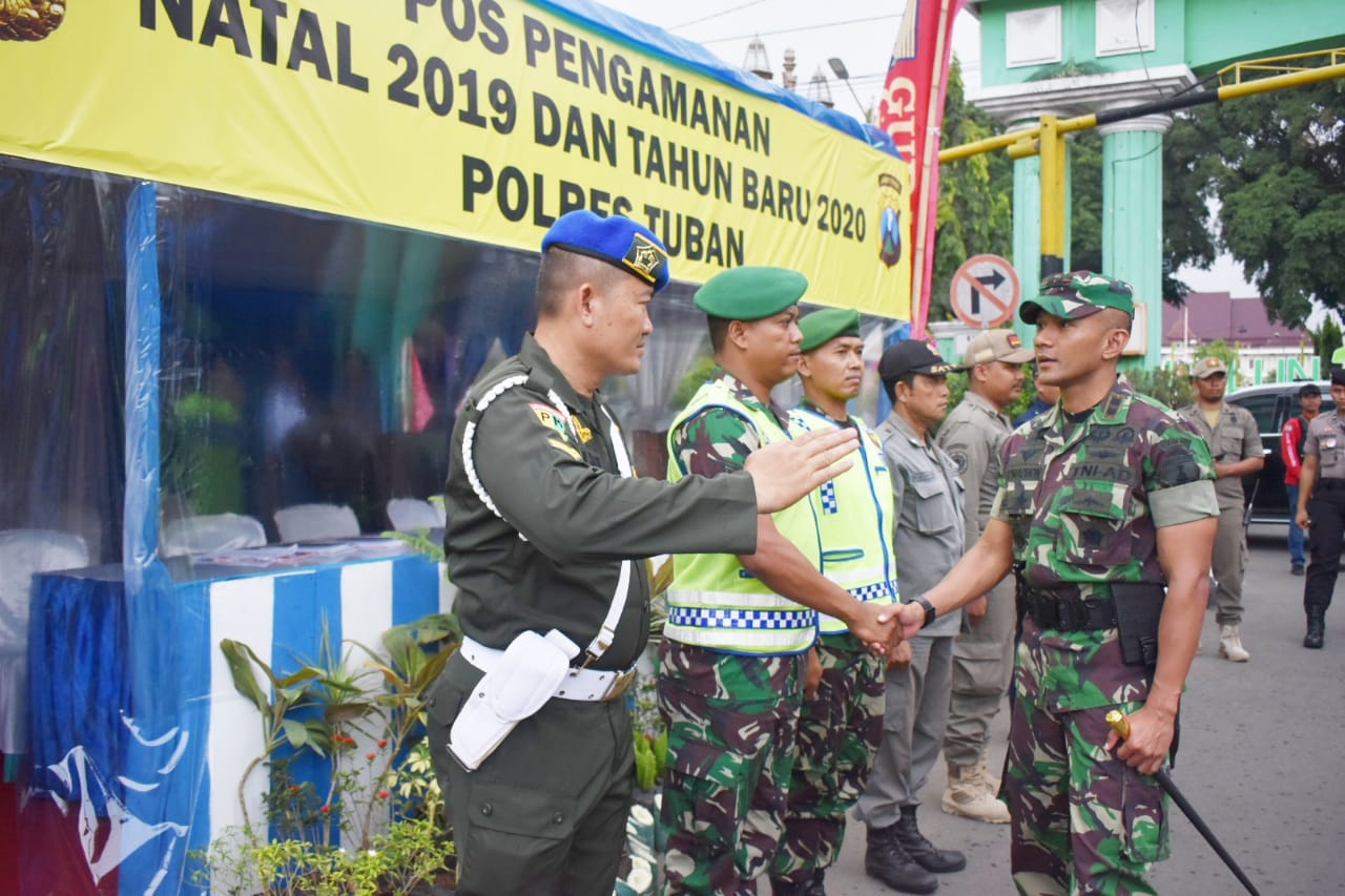 Komandan Kodim 0811/Tuban Letkol Inf Viliala Romadhon S.E.,M.I.Pol., bersama Kapolres AKBP Nanang Haryono Sik., melakukan pemantauan pengamanan perayaan Natal dan tahun baru 2020 di sejumlah Pos Pengamanan di Kabupaten Tuban, Rabu(25/12/2019).