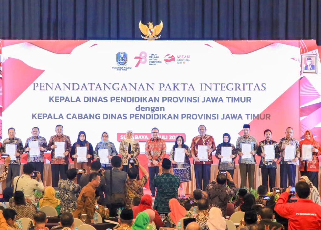 Selain itu, Gubernur Khofifah menyaksikan penandatanganan Pakta Integritas antara Ka. Disdik Prov. Jatim dengan 24 orang Kacabdin Disdik Prov. Jatim dan sejumlah perwakilan kepala sekolah dengan komite sekolah dari beberapa Kabupaten Kota di Jawa Timur.