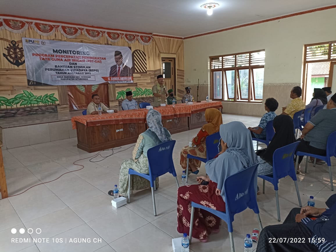 Hal itu sesuai dengan tema yang diusung, yakni “Monitoring Program Percepatan Peningkatan Tata Guna Air Irigasi (P3T-GAI) dan Bantuan Stimulan Perumahan Swadaya (BSPS) tahun anggaran 2022” untuk kemanfaatan masyarakat, yang berlangsung di balairung kantor Desa Jangkar, Kecamatan Jangkar, Kabupaten Situbondo, Jawa Timur. Jumat, (22/7/2022) kemarin sore.