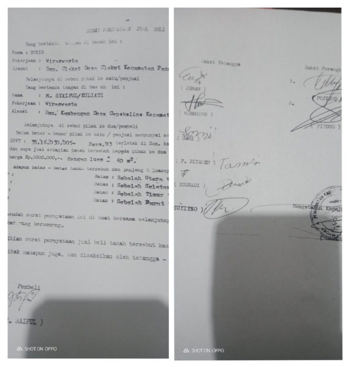 Foto: Surat Jual Beli yang di ajukan pemohon sabagai syarat PtLSL Di duga hasil Rekayasa