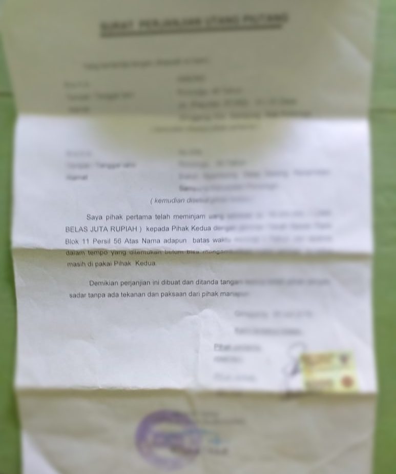 Dalam perjanjian yang di tulis tanggal 26 Juli 2016 dengan mengetahui Kepala Desa (Tanda Tangan dan Stampel Pemerintahan Desa) di sebutkan “Saya Pihak Pertama (Kasun) telah meminjam uang sebesar Rp. 15.000.000 kepada pihak kedua dengan jaminan Tanah Sawah pada Blok 11, Persil 56 atas nama…(kosong tidak disebutkan dalam surat pernyataan). Adapun batas waktu minimal 1 tahun dan apabila dalam tempo yang di tentukan belum bisa mengembalikan maka jaminan tersebut masih di pakai pihak kedua”. Yang kemudian di tanda tangani pihak 1 dan Pihak 2 serta mengetahui Kepala Desa Setempat dengan lengkap di bubuhi Tanda tangan dan Stampel pemerintah desa.