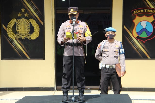 Kapolres Lumajang AKBP Deddy Foury Millewa S.H S.I.K M.I.K membacakan amanat Kapolri Jenderal Idham Aziz menyampaikan beberapa penekanan untuk dipedomani bagi seluruh anggota yang bertugas dalam Operasi Lilin Semeru 2020
