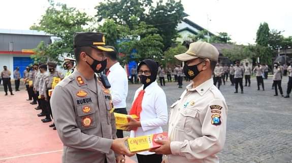 Kapolres Tuban usai Kegiatan apel pagi untuk menjaga stamina, didampingi Kabag Sumda Kompol Mardiyah Kapolres membagikan Vitamin kepada anggotanya.(@nt).