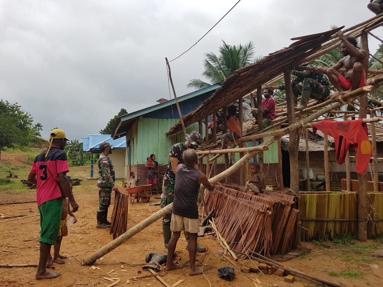 Tak hanya perasaan gembira saja, di lokasi itupun Paulus juga mengajak beberapa warga untuk ikut serta memperbaiki rumah adat tersebut. “Supaya cepat selesainya. Kami bantu bapak-bapak TNI ini perbaiki rumah adat itu,” tuturnya.