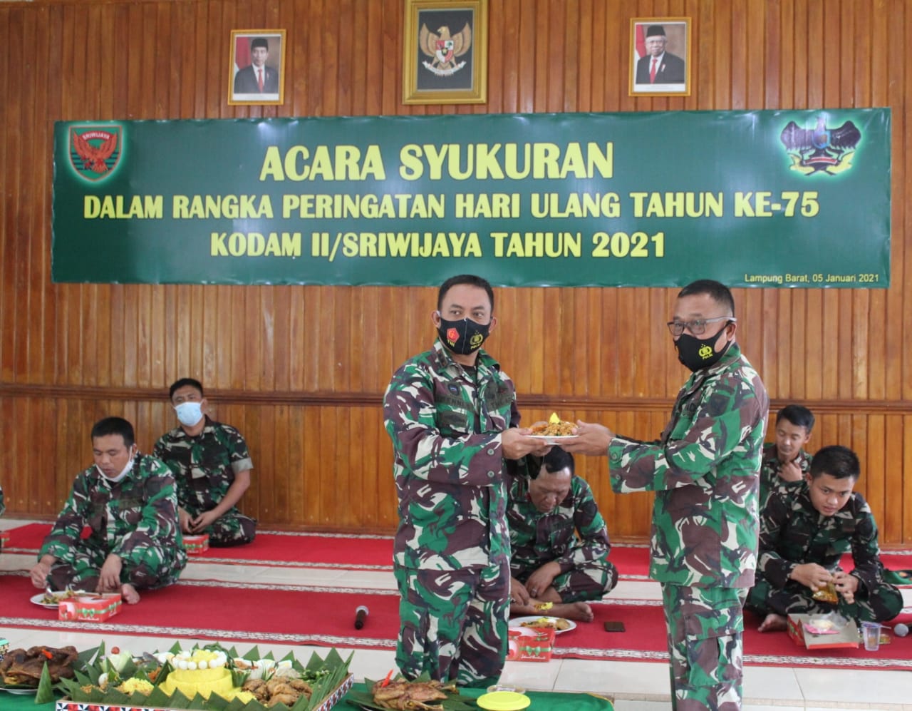 Mengingat masih dalam masa pandemi Covid-19, Acara syukuran dalam rangka memperingati hari jadi Kodam II/Sriwijaya yang ke-75 di gelar secara serentak di jajaran Kodam II/Sriwijaya yang di laksanakan di satuan masing – masing.