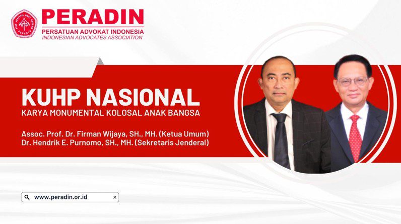 Ketua Umum dan Sekretaris Jenderal Persatuan Advokat Indonesia (PERADIN), Dr. Firman Wijaya, S.H., M.H. dan Dr. Hendrik E. Purnomo, S.H., M.H., ACIArb. C.Med., mengapresiasi Badan Legislatif dan Pemerintah terkait pengesahan RKUHP carry over menjadi KUHP Nasional per hari Selasa, 6 Desember 2022. Mimpi peradaban hukum modern Indonesia yang ingin memiliki KUHP Nasional sejak tahun 1963 akhirnya terwujud pada hari ini. Ekspresi modernisasi Hukum Pidana bangsa Indonesia begitu terlihat dengan pergeseran-pergeseran paradigma Hukum Pidana yang tadinya selalu berangkat dari efek jera/restitusi ke arah perbaikan/restorasi.