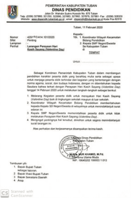 Pemerintah Kabupaten (Pemkab) Tuban melalui Dinas Pendidikan telah mengeluarkan surat larangan perayaan hari kasih sayang atau valentine day yang jatuh pada 14 Februari 2020. Larangan ini berlaku bagi seluruh pelajar di Kabupaten Tuban.