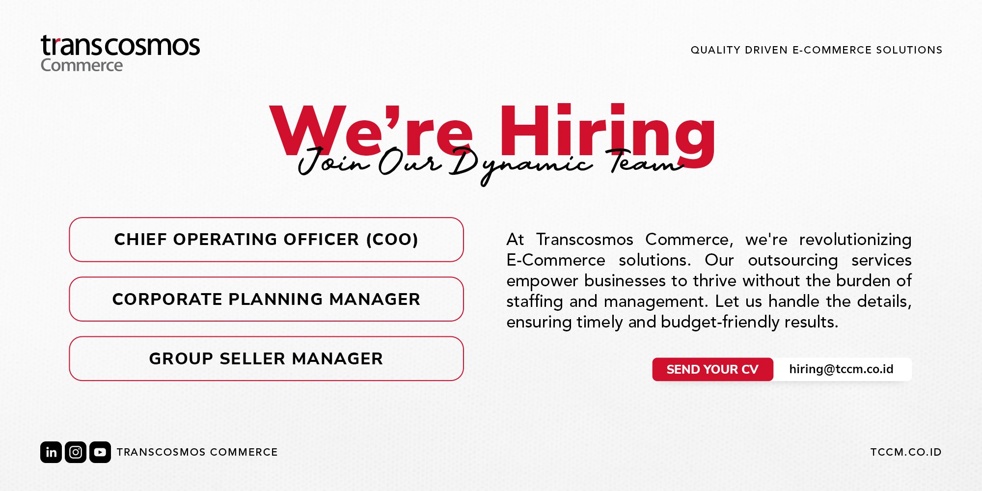 Transcosmos Commerce, bagian dari Transcosmos Group yang berpusat di Tokyo, Jepang, dan telah sukses berekspansi di 27 negara, membuka kesempatan bagi individu-individu berbakat dan berpengalaman untuk membawa inovasi ke dunia E-Commerce Indonesia.