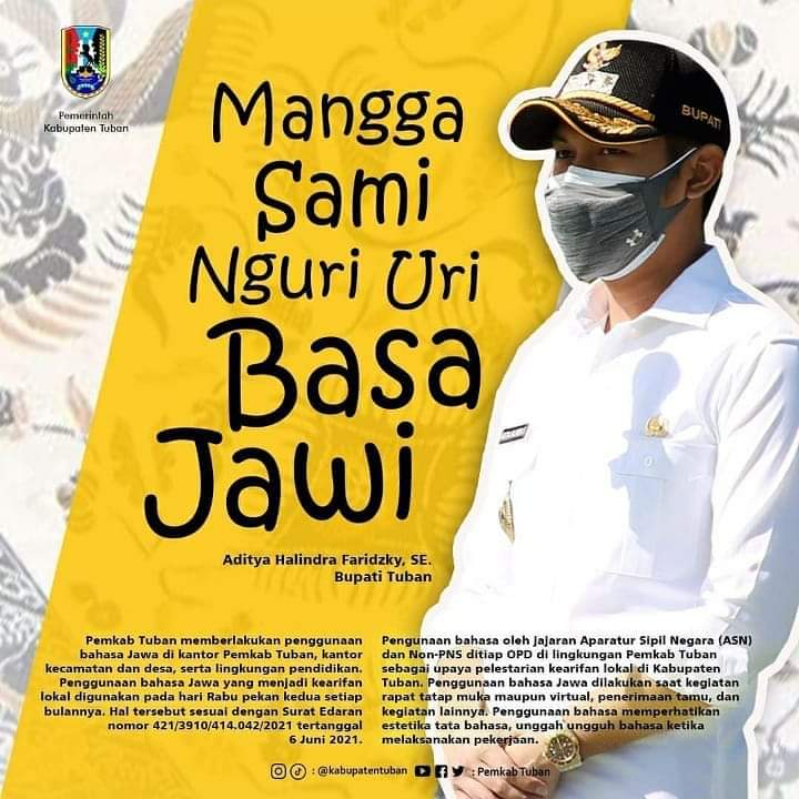 Bupati Tuban, Aditya Halindra Faridzky, SE., yang akrab disapa Mas Lindra kepada Media Republik News menjelaskan, pengunaan bahasa oleh jajaran Aparatur Sipil Negara (ASN) dan Non-PNS ditiap OPD di lingkungan Pemkab Tuban sebagai upaya pelestarian kearifan lokal di Kabupaten Tuban. Rabu (07/07/2021),