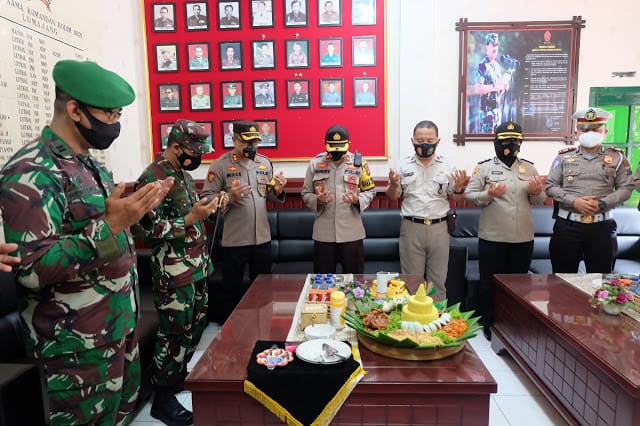 Kapolres memberikan potongan tumpeng yang diberikan secara langsung kepada Dandim 0821 sebagai ungkapan selamat di hari ulang tahun Kodam V Brawijaya