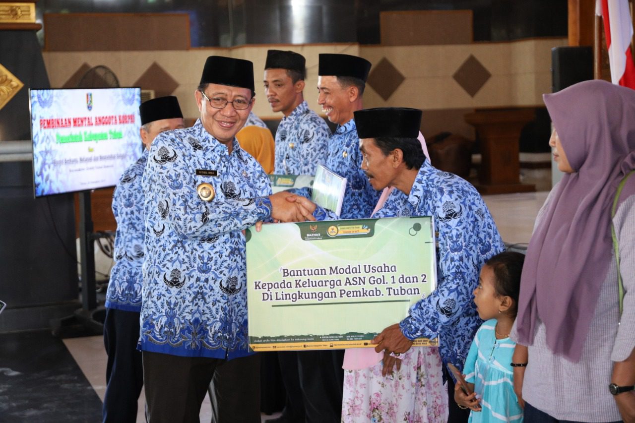 Pada kesempatan ini, Bupati Tuban juga menyerahkan bantuan modal usaha kepada sejumlah keluarga ASN golongan 1 dan 2 Pemkab Tuban.