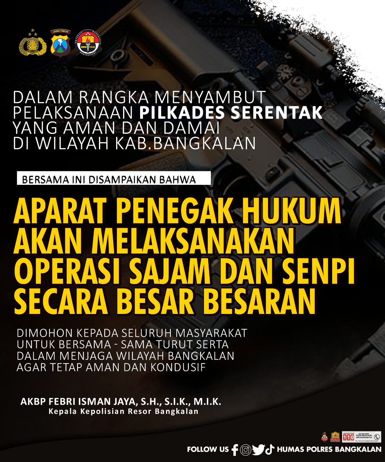 Kapolres Bangkalan AKBP Febri Isman Jaya menegaskan “aparat penegak hukum akan melaksanakan operasi Sajam dan Senpi secara besar-besaran serta mengimbau sekaligus kepada para calon kepala desa berikut tim suksesnya dan seluruh masyarakat di kabupaten Bangkalan untuk tetap menjaga situasi Kamtibmas agar tetap kondusif,baik dan sebelum juga saat pencoblosan, hingga saat pengumuman kepala desa terpilih nantinya” ujarnya (06/05/2023).