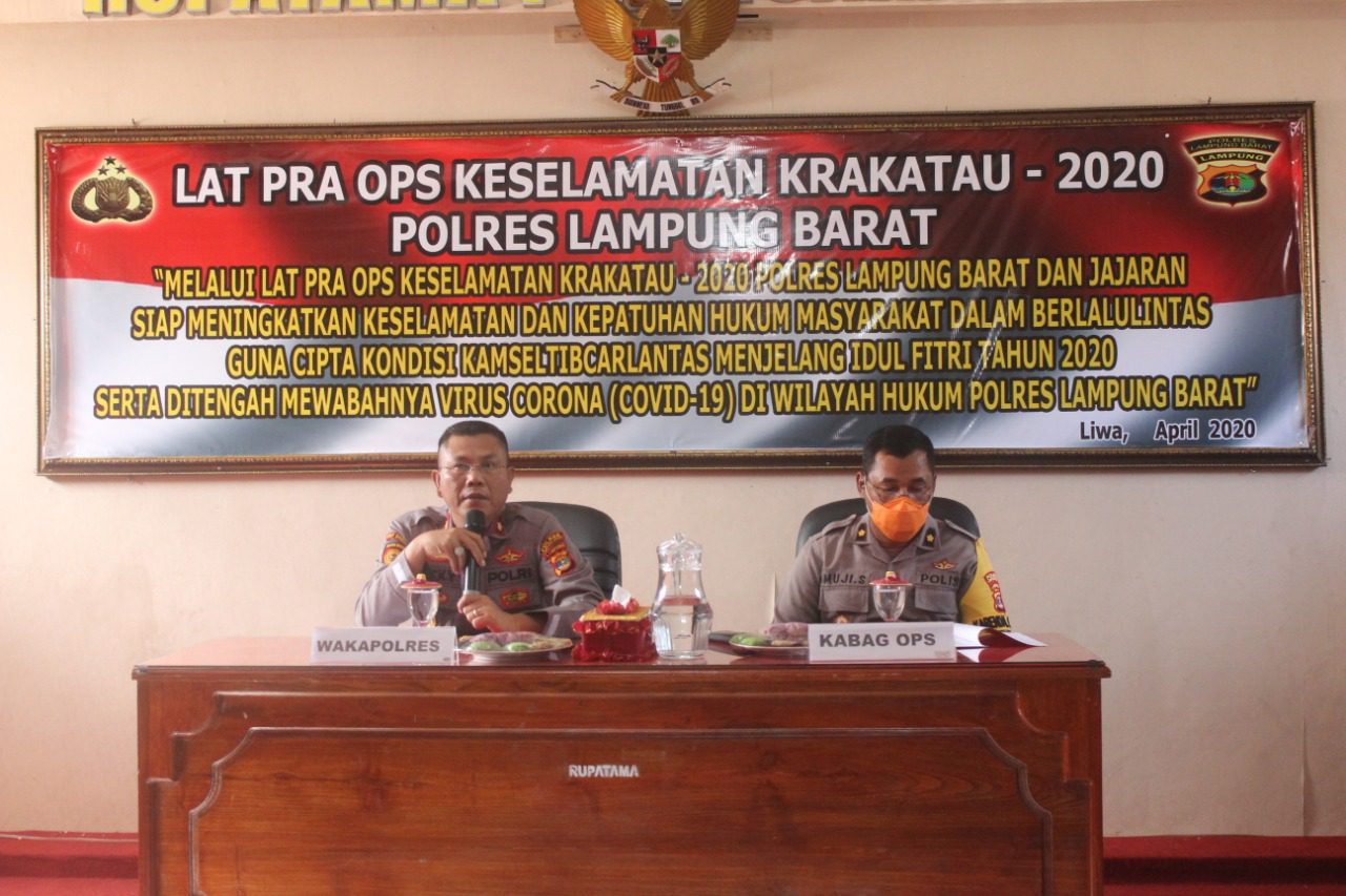 Waka Polres Kompol Vicky D Zulkarnain mendampingi Kapolres Lampung Barat AKBP Rachmat Tri Hariyadi,S.IK.,M.H.mengungkapkan tujuan operasi keselamatan krakatau 2020 ini untuk meningkatkan kesadaran masyarakat tentang lalu lintas angkutan jalan, terwujudnya masyarakat tertib dan patuh hukum dalam berlalu lintas serta membantu masyarakat pengguna jalan dalam mencegah penyebaran virus Covid19. “Operasi keselamatan Krakatau 2020 akan digelar selama 14 hari terhitung mulai tanggal 6 April S/D 19 April 2020,”ucap waka Polres.