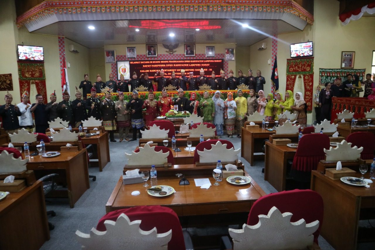 Rapat paripurna tersebut berlangsung di ruang sidang Maghgasana DPRD Lampung Barat yang dihadiri langsung oleh Bupati Lampung Barat Hi. Parosil Mabsus, Wakil Bupati Drs. Mad Hasnurin, Ketua DPRD Lampung Barat Edi Novial dan para anggota, Kapolres Lampung Barat AKBP Heri Sugeng Priyanto, Dandim 0422/LB Letkol Czi. Anthon Wibowo, Kepala Kejaksaan Negeri Lampung Barat Deddy Sutendy, SH., MH., Ketua Pengadilan Negeri Liwa, Sekda Lampung Barat Drs. Nukman, seluruh Assisten Bupati, Staf Ahli, Kepala Perangkat Daerah Lampung Barat, Organisasi Wanita, Camat, Instansi vertikal, Tokoh Adat dan Tokoh Masyarakat.