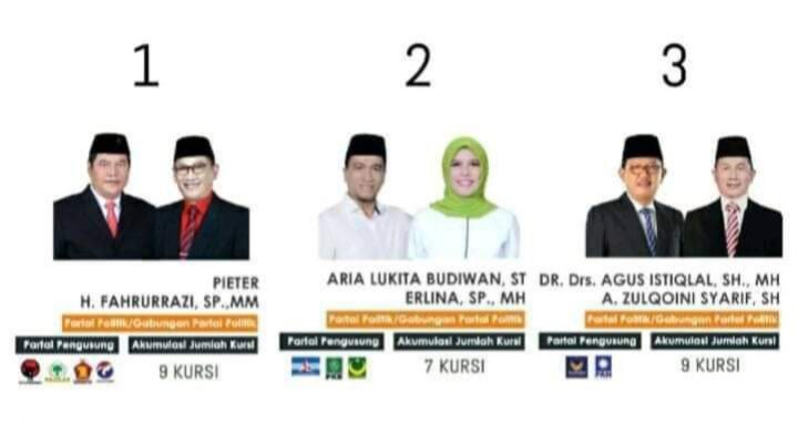 Dalam pengundian nomor urut tersebut untuk pasangan calon nomor urut satu yakni pasangan calon Pieter-Fahrurrazi, nomor urut dua pasangan calon Aria Lukita Budiwan-Erlina dan nomor urut tiga pasangan calon Agus Istiqlal-A. Zulqoini Syarif. (Nur)
