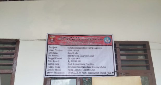 Lambar, RepublikNews – Rehabilitas Rumah dinas (Rudin) dengan tingkat kerusakan sedang atau berat di SDN 1 Luas Kecamatan Batu Ketulis kabupaten Lampung Barat diduga tak sesuai Rancangan Anggaran Biaya (RAB). Proyek rehabilitasi ini dianggarkan sebesar Rp 104.500,000 dari sumber anggaran dari Dana Alokasi Khusus (DAK) 2020. di lokasi kegiatan ditemukan beberapa ‘kecurangan’, yang dilakukan oleh pihak sekolah maupun pihak pelaksana kegiatan.