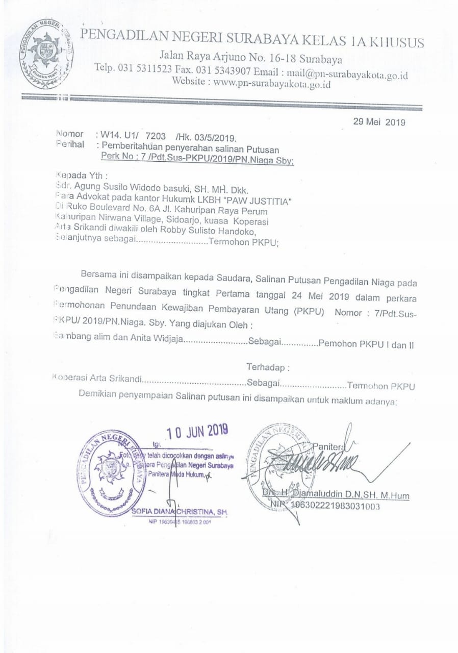 “Tapi saya verifikasi dulu ke Pengadilan Niaga Surabaya atas benar tidaknya putusan pailit KSP Artha Srikandi,” ujar Syamsul Muarif dengan gayanya yang santai namun serius.