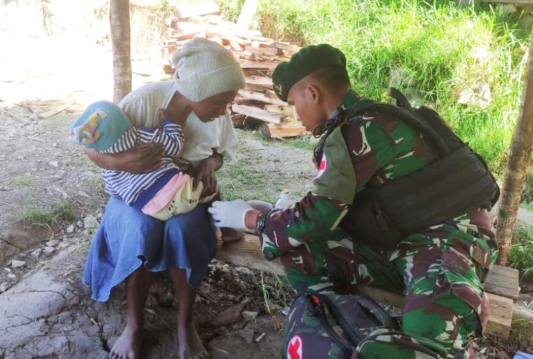 Pelayanan kesehatan itu, kali ini ditujukan bagi warga yang berada di Pos Tiom. Beberapa personel kesehatan pun diterjunkan oleh pihak Satgas.