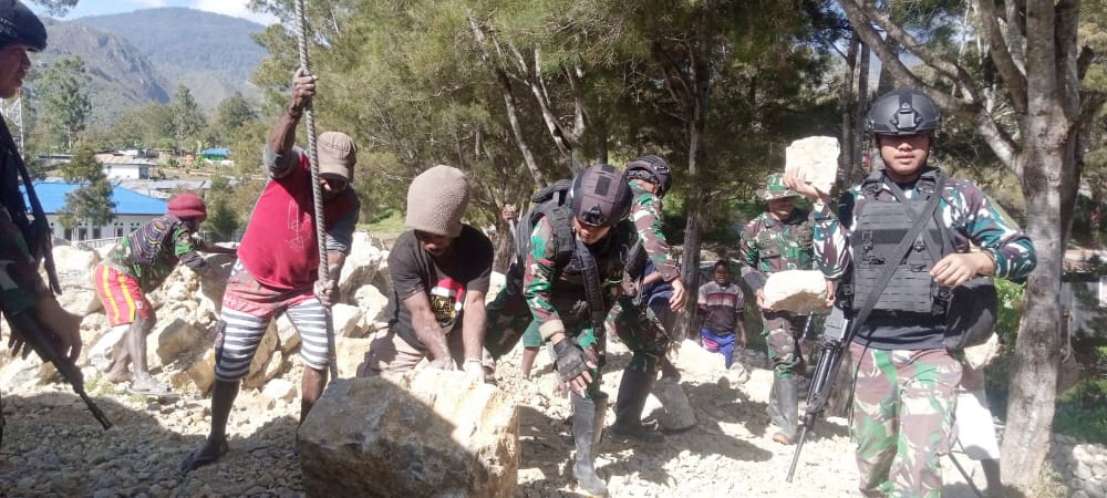 Hal itu, terlihat ketika Satgas dibawah kendali Mayor Inf Ahmad Zaki bergotong-royong bersama warga memperbaiki adanya jalan setapak menuju Gereja Baptis Wiyiware Pirime, Kecamatan Pirime, Lannya Jaya. pada Rabu, 6 Juli 2022.