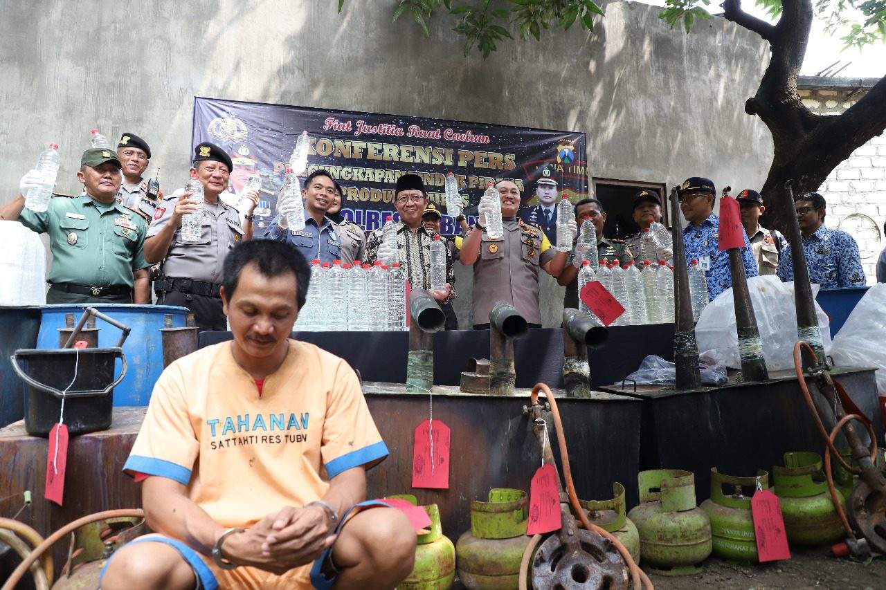 Hal tersebut membuat Bupati Tuban H fathul Huda bersama Kapolres dan Dandim Tuban melakukan konferensi pers terkait penggrebekan produksi minuman keras (Miras) di Desa Tegalagung, Semanding, Selasa (02/04/2019).