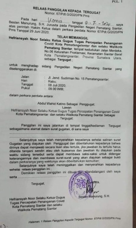 Siantar, RepublikNews – Gugatan class Action terhadap Walikota Pematang Siantar Heefriansyah SE sebagai Ketua Gugus Percepatan penanggulangan (TGPP) covid19 Pemko Siantar Yang dilakukan Warga Gang Demak Pematang Siantar Sumatera Utara memasuki babak baru diPengadilan Pematang Siantar 8/7.