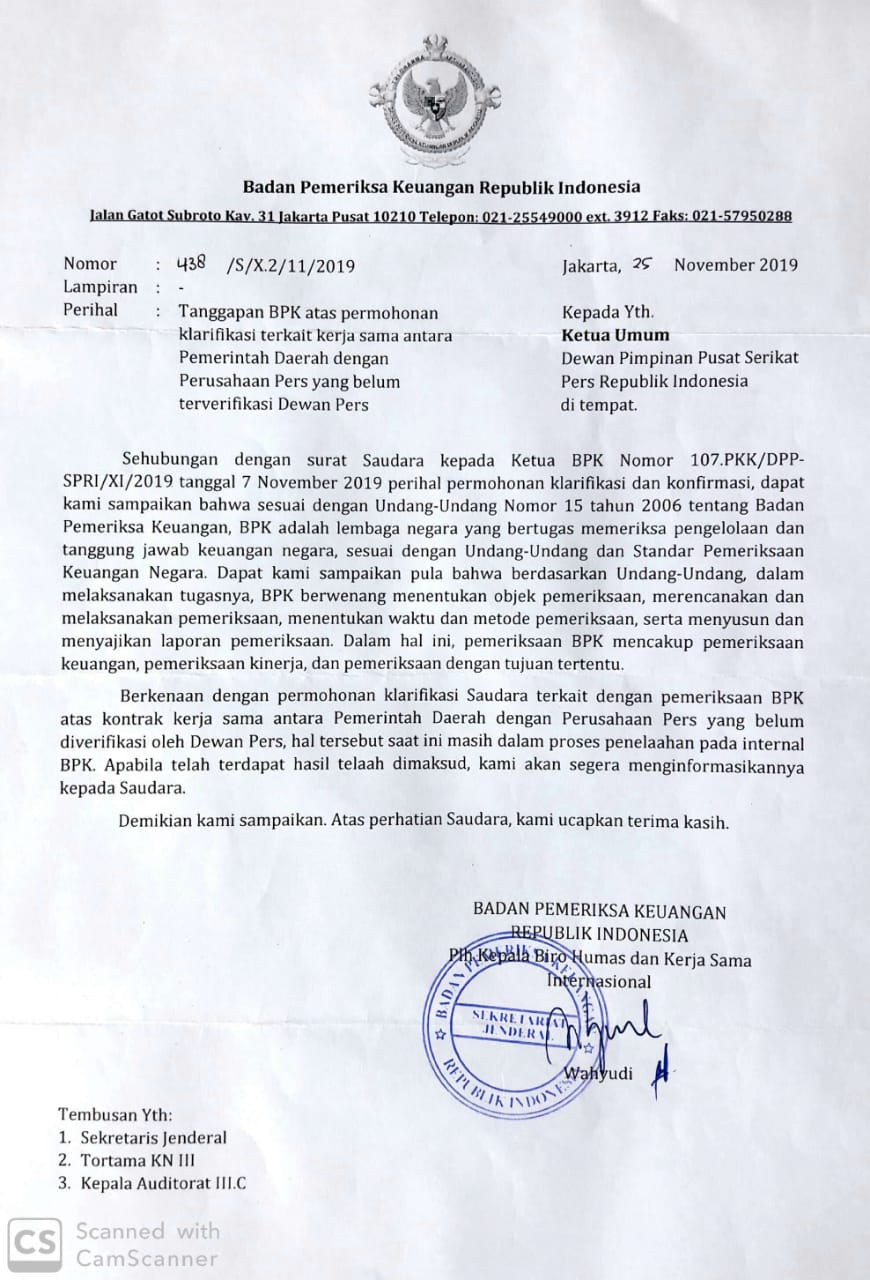 BPK RI akhirnya menjawab surat SPRI tersebut melalui suratnya nomor : 438/S/X.2/11/2019 tangal 25 Noveber 2019, tentang Tanggapan BPK atas permohonan klarifikasi terkait kerja sama antara pemerintah daerah dengan perusahaan pers yang belum diverifikasi Dewan Pers.