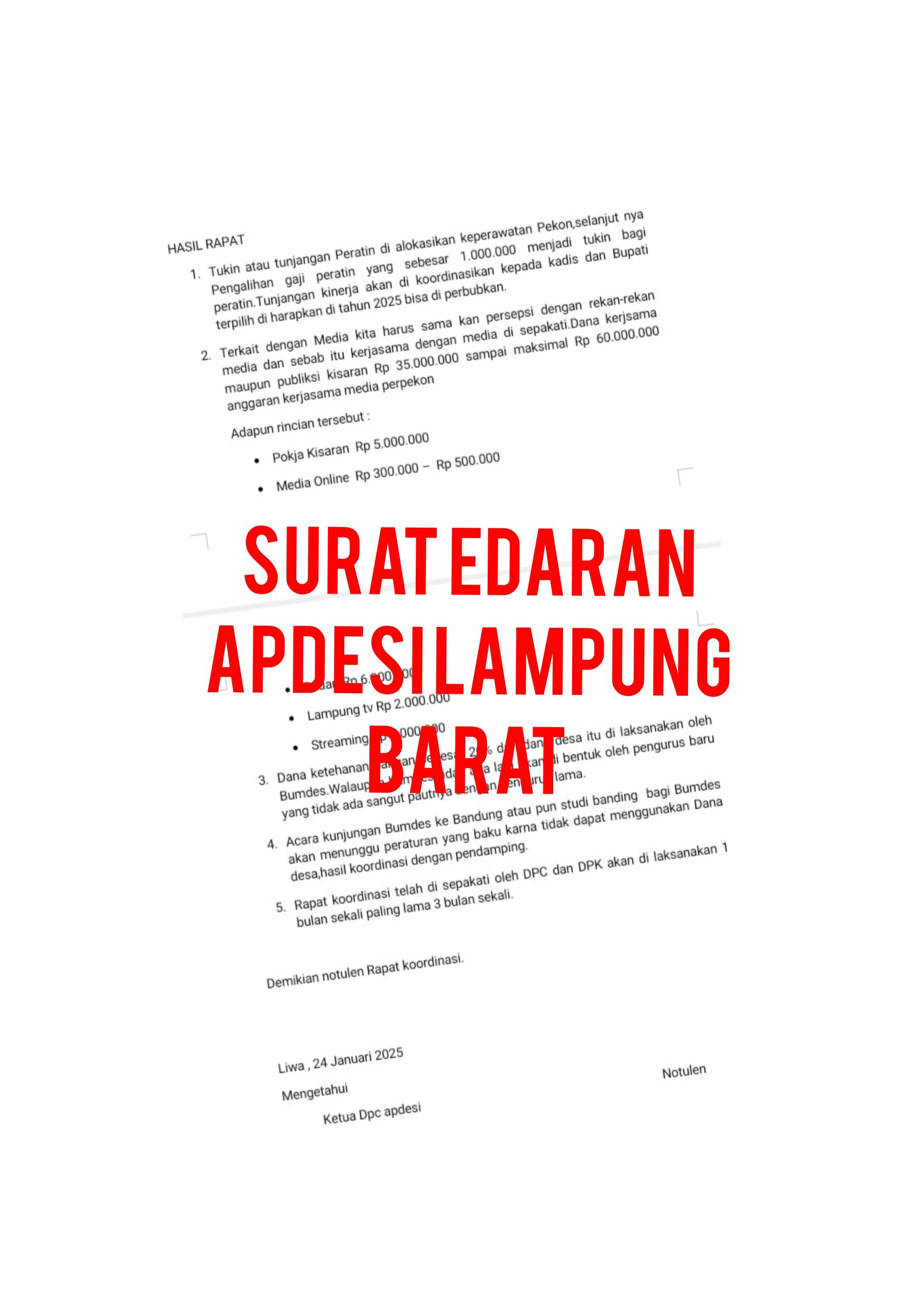 Belum lagi dalam surat edaran tersebut, ketua DPC APDESI diwajibkan menyamakan persepsi dengan Rekan Rekan media disepakati dana publikasi berkisaran Rp. 35.000.000 sampai Rp. 60.000.000 per pekon