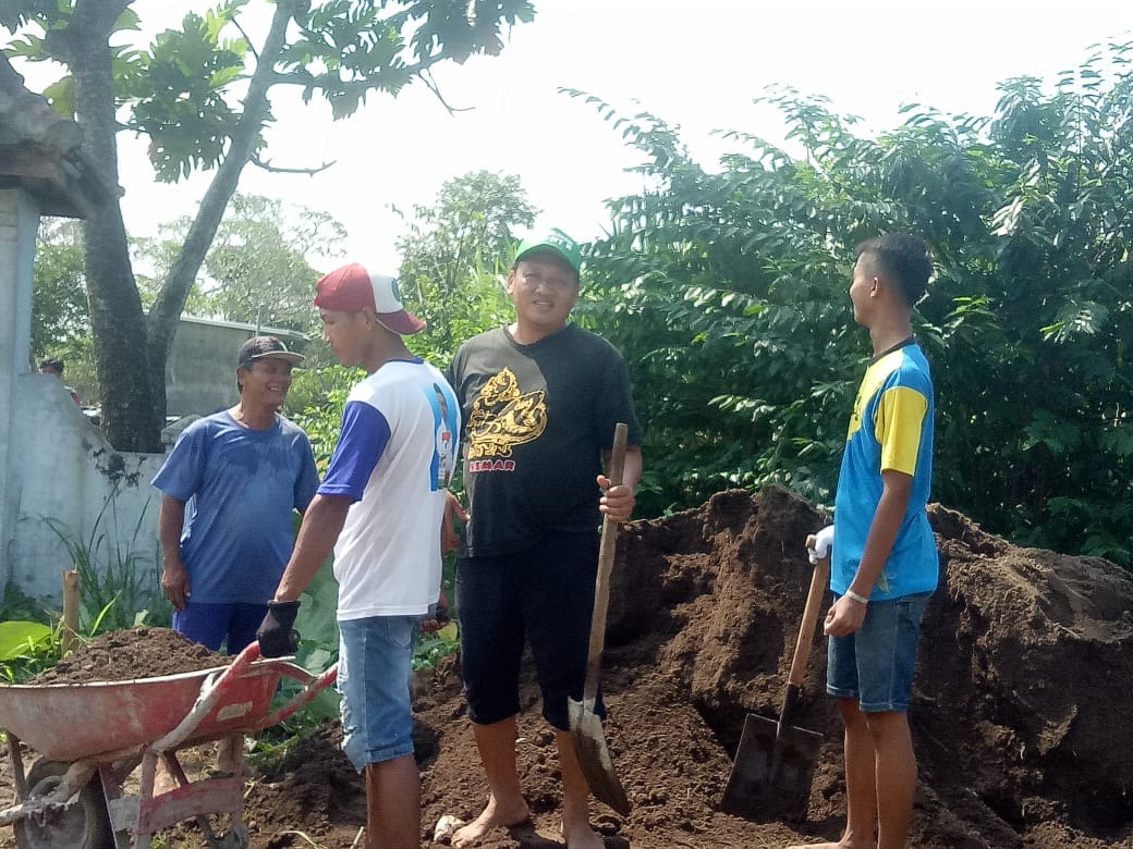 Terlihat masyarakat sedang melakukan kerja bakti mengerjakan jalan makam Gambuhan di sela sela situasi dan kondisi negara lagi mengalami pandemi Covid 19.