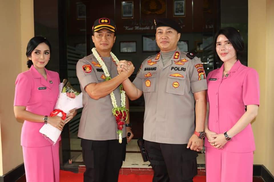 Disambut oleh AKBP Nanang Haryono, S.H., S.I.K., M. Si beserta istri Ny. Nany Nanang Haryono di gerbang Mapolres Tuban, Jumat (21/02/2020). Acara dilanjutkan dengan pengalungan kalung bunga dan pemberian bucket bunga.