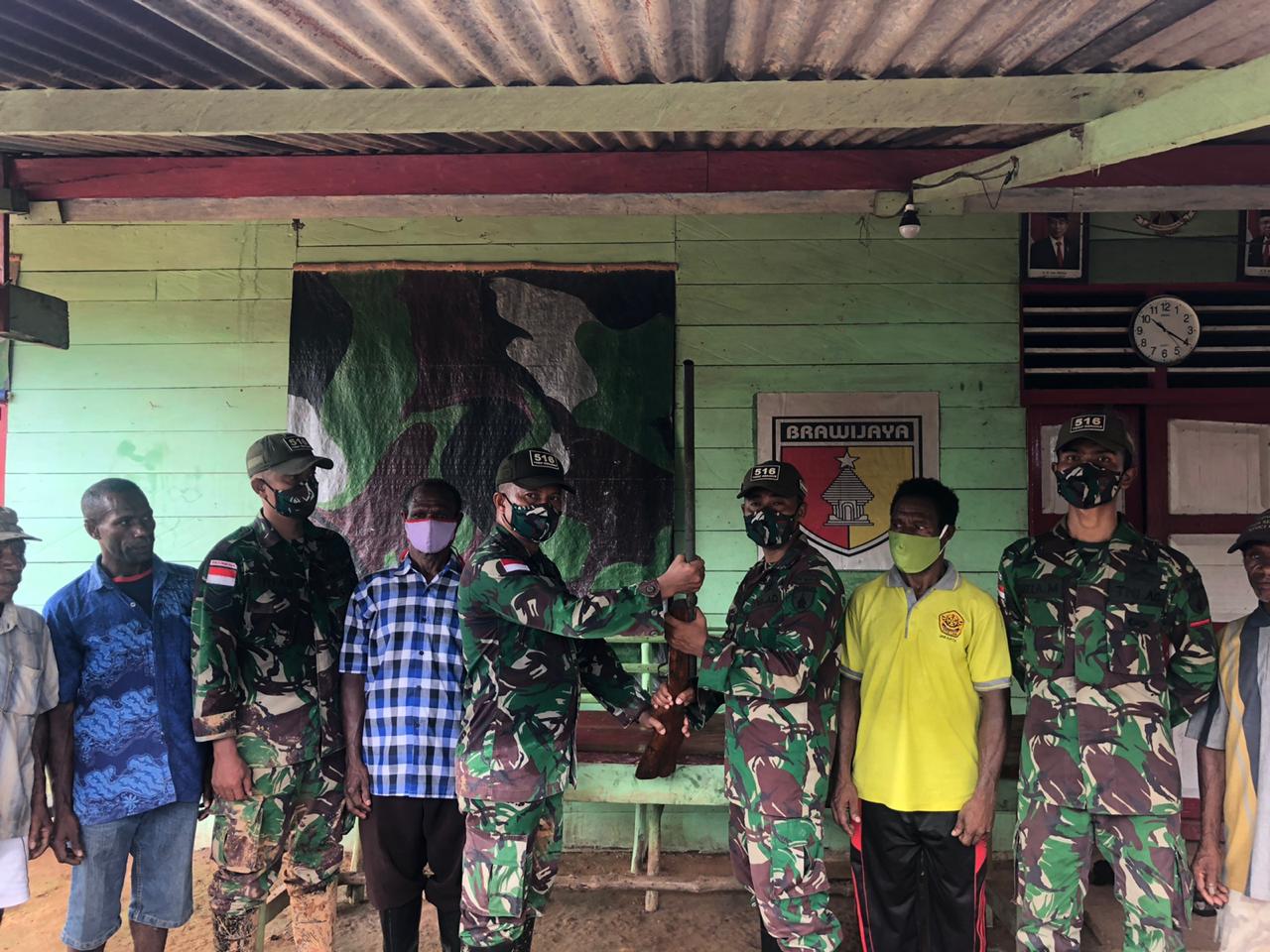 Dengan melakukan pendekatan secara persuasif, alhasil Satgas pun berhasil mengamankan senjata api laras panjang jenis Engkelop dari tangan salah satu keluarga tersebut.